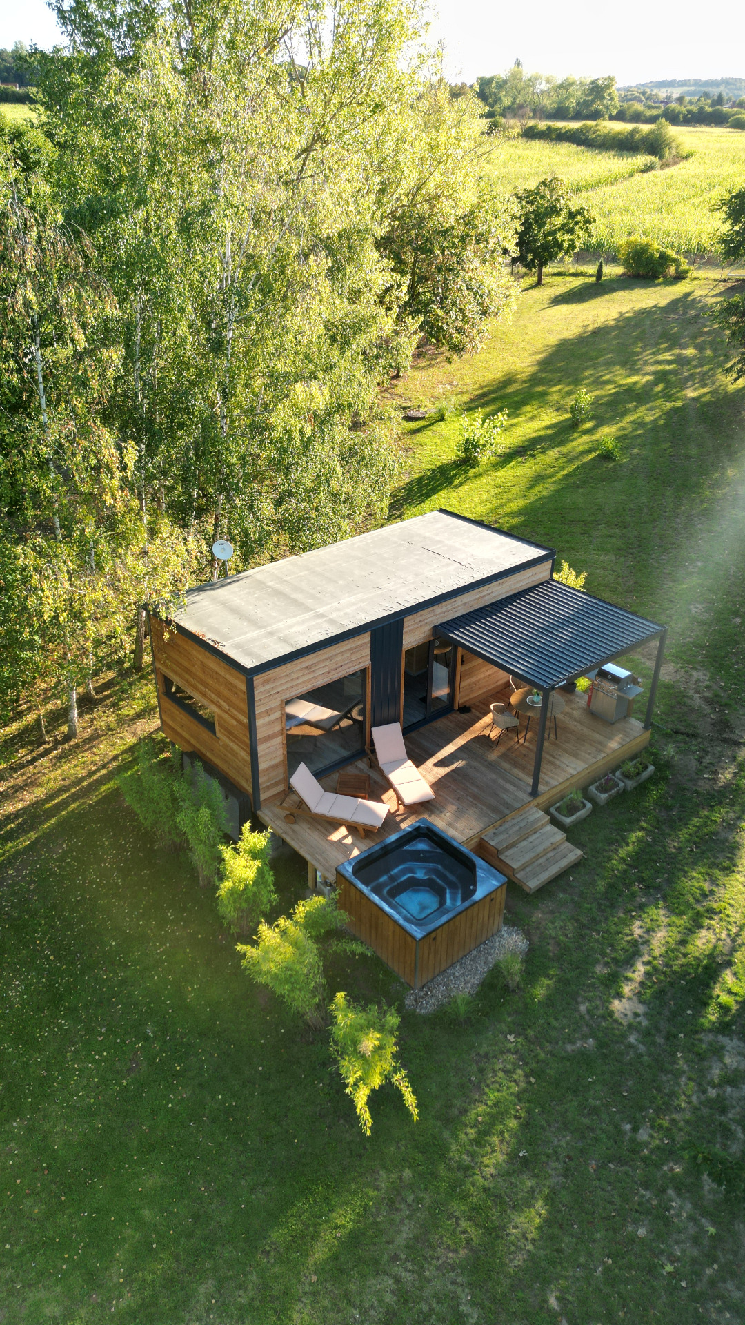 Náš tinyhouse stojí mezi polem a výběhy koní, obklopený vzrostlou zahradou. Z terasy je vidět západ slunce, vířivka pod širým nebem tiší myšlenky a vůně dřeva ze sauny připomíná staré časy, kdy na všechno bylo víc času.